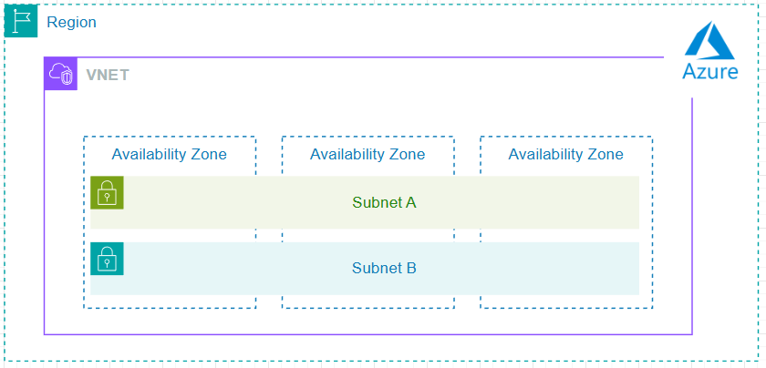 - Virtual Network (VNet): Regional scope (spans the whole region)